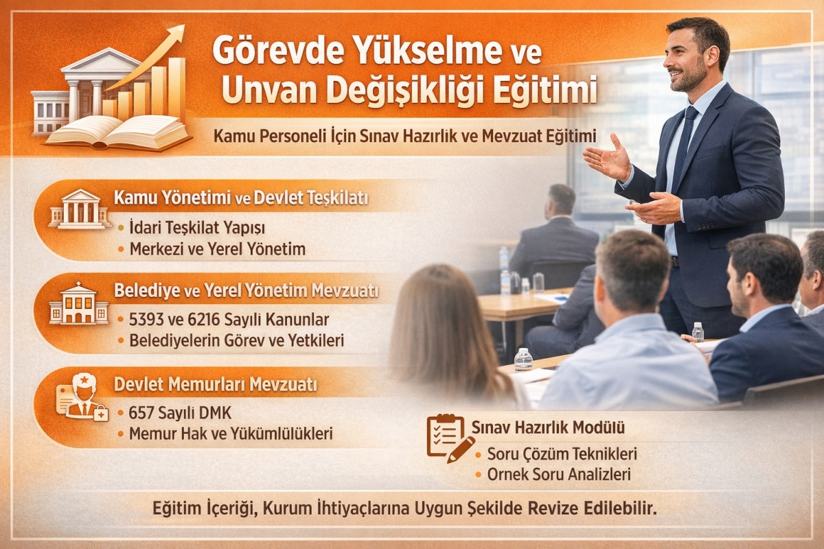 Kamu personeline yönelik hazırlanan Görevde Yükselme ve Unvan Değişikliği Eğitimi; sınavlarda yer alan temel mevzuat konularını sistematik şekilde ele alarak katılımcıların sınav hazırlık süreçlerini desteklemeyi amaçlamaktadır. Eğitimde kamu yönetimi yapısı, yerel yönetim mevzuatı, 657 sayılı Devlet Memurları Kanunu ve sınav teknikleri uygulamalı anlatımlarla aktarılmaktadır. Kontenjan sınırlı olup program minimum 10 katılımcı ile gerçekleştirilecektir. Detaylı Bilgi İçin Tıklayınız »
